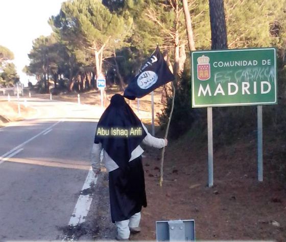 Abu Ishaq Arifi (uno de los arrestados ayer), con una bandera del Estado Islámico en una carretera de Ávila limítrofe con la Comunidad de Madrid. La imagen ha sido obtenida de la cuenta de Facebook del detenido.