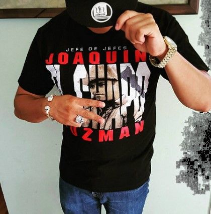 La tienda online Kartel Kollection ofrece playeras con estampados de varios criminales, entre ellos El Chapo Guzmán, con la leyenda “Jefe de jefes” y su ya conocida fotografía tomada cuando se encontraba internado en el penal federal de Puente Grande.