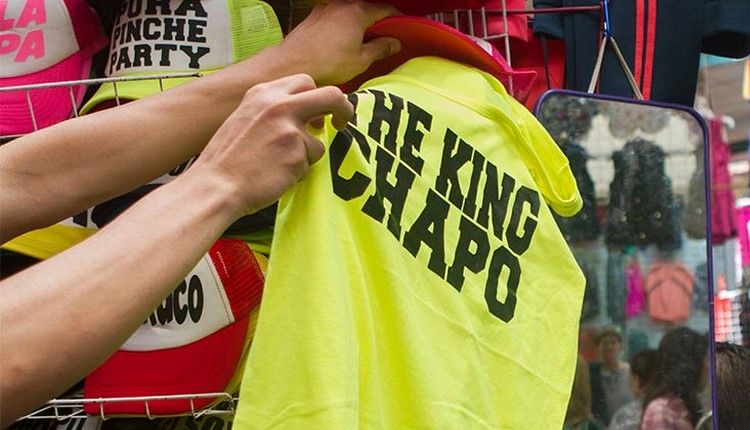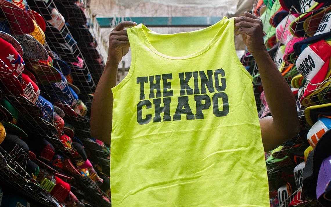 Playeras, gorras, sudaderas, entre otros objetos que tienen las leyendas “The King Chapo” (El rey Chapo) o “God save al Chapo” (Dios salve a El Chapo).