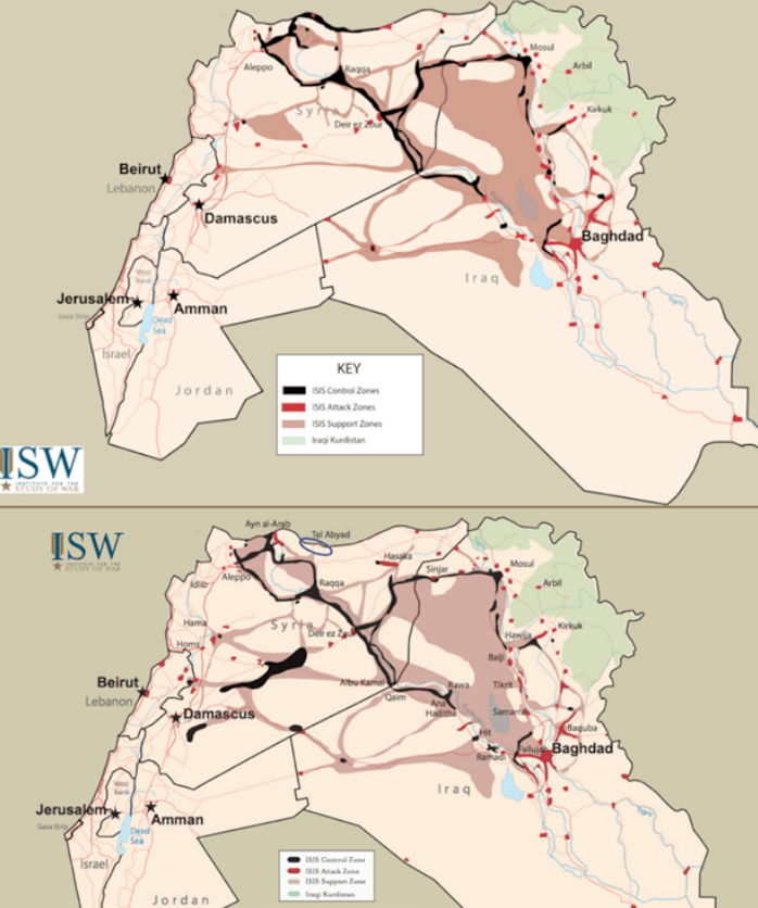 La presión internacional y los ataques continuados contra objetivos clave desembocan en una pérdida de poder y capacidad operativa de la organización, que pasa varios años intentando recomponerse sin un éxito remarcable. En el mes de mayo de 2010, Abu Bakr al Baghdadi asume el liderazgo del Estado Islámico de Irak. A comienzos del 2012, el grupo lanza una campaña para reflotar su actividad y recuperar el territorio perdido en esos seis años. Sin embargo, será a partir de abril de 2013 cuando los medios comiencen a hacerse más eco de las acciones de esta rama territorial de al-Qaeda y cuando declaran que el grupo Jabhat al Nusra es su escisión en Siria. Desde ese momento, pasan a denominarse como el Estado Islámico en Irak y en Siria/Levante (ISIS/ISIL en inglés). La polémica es casi inmediata ya que al-Nusra rechaza esta declaración y no aceptan ser sus subordinados. Desde entonces, ISIS comienza una campaña de ataques en Siria contra otros grupos armados, cambiando por completo el panorama en el país. Avanzan a una velocidad considerable y comienzan a sumar apoyos al tiempo que acumulan detractores. Su gran golpe de efecto tendrá lugar en enero de 2014 cuando logran hacerse con el control de la ciudad Siria de Raqqa, la cual pasa a convertirse en la capital del emirato.