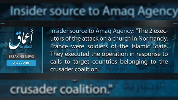 "Los asaltantes de la iglesia de Normandía son dos soldados del Estado Islámico que actuaron en respuesta al llamado del ISIS a atacar a los países de la coalición", señala en referencia a los Estados que integran la alianza antiterrorista liderada por Estados Unidos, en Irak y Siria.