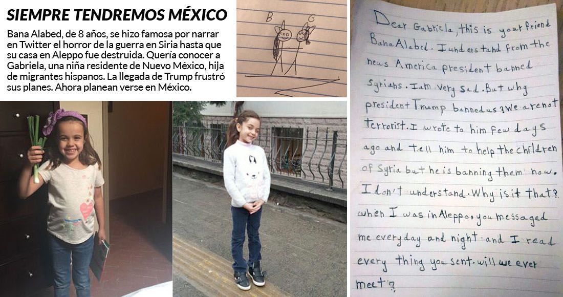 Bana Alabed, de siete años, narró durante meses en Twitter su vida en Aleppo, de donde logró salir para refugiarse en Turquía. Planeaba visitar Estados Unidos en febrero para conocer a Gabriela, una niña de su edad que la seguía en la red social. Pero el veto de Trump cambió su plan original y ahora valoran encontrarse en México.