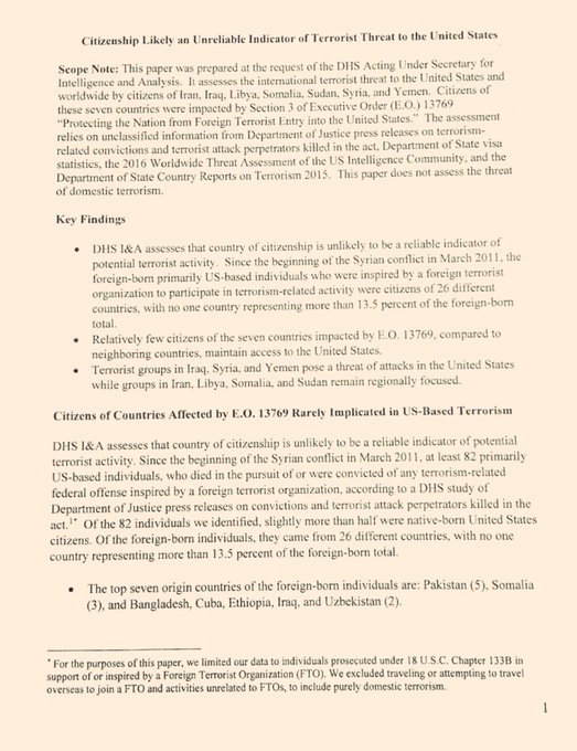 Un informe publicado por analistas de Inteligencia del Departamento de Seguridad Nacional de EE.UU. determina que los ciudadanos de los siete países de mayoría musulmana a los que Donald Trump prohibió la entrada a EE.UU., no representan una amenaza terrorista para el país norteamericano por el mero hecho de tener esa ciudadanía, informa AP.