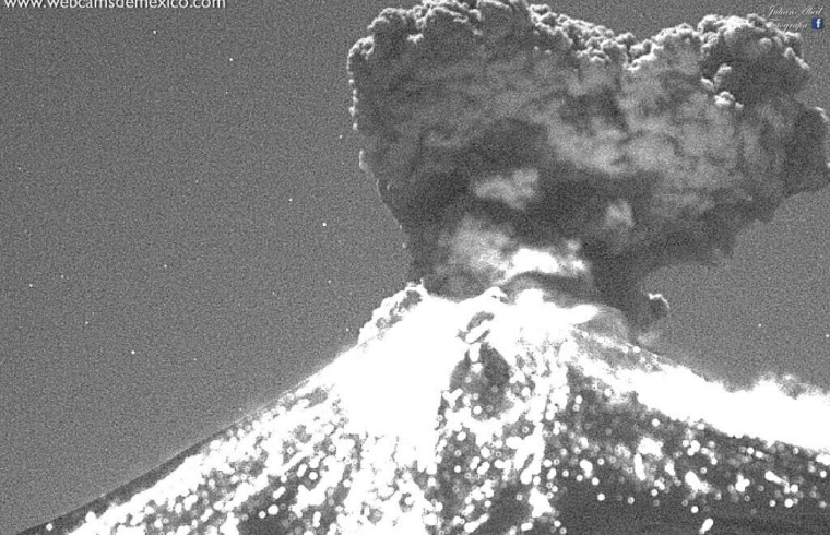 Tres explosiones de alta intensidad registró el volcán Popocatétl durante la madrugada de este jueves. Las imágenes feron captadas por webcams de México y Sky Alert.