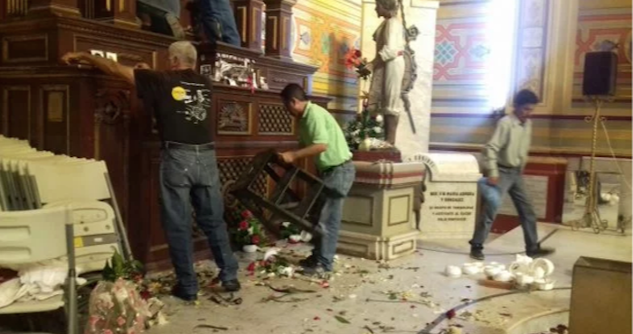 Tras el ataque, voluntarios limpiaron el destrozo ocasionado por la mujer y los restos de la imagen fueron llevados a las oficinas de la catedral donde fueron resguardados.