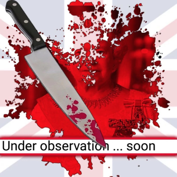 El póster distribuido en redes sociales muestra un retrato de la regente inglesa y la bandera de Gran Bretaña manchadas por sangre y amenazadas por un cuchillo.