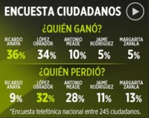 En la misma encuesta telefónica, se indica que el perdedor del debate fue Andrés Manuel López Obrador: 32 por ciento opinaron que el tabasqueño tuvo el peor desempeño, seguido de José Antonio Meade con un 28 por ciento, Margarita Zavala con el 13 por ciento, El Bronco con el 11 por ciento y Anaya con el 9 por ciento.