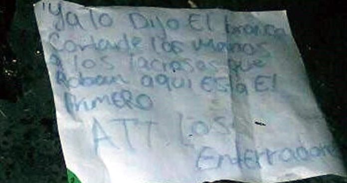 “Ya lo dijo El Bronco cortarle las manos a los lacrosos que roban aquí esta el primero ATT Los Enterradores”, (sic.), se lee en el aterrador cartel escrito con plumón azul.