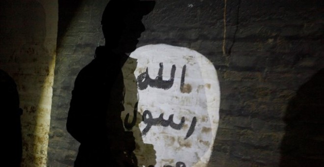La sombra de un hombre armado vista sobre una pintada con el símbolo del Estado Islámico.REUTERS/Alaa al-Marjani