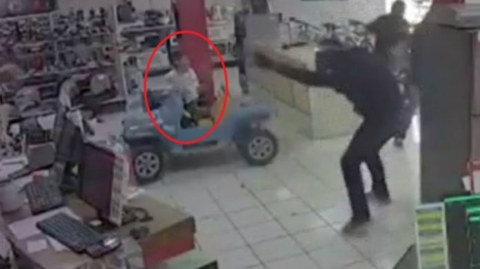 En un video captado por las cámaras de seguridad se puede observar a dos pequeños que quedaron en medio de la balacera; un par de mujeres se tiran al piso, mientras los niños quedan en medio del enfrentamiento entre uno de los guardias y los asaltantes.