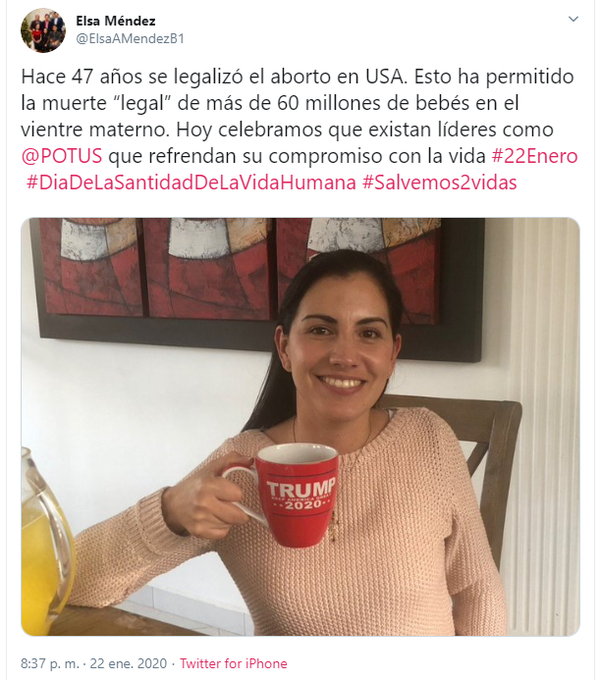 “Esto ha permitido la muerte legal de más de 60 millones de bebés en el vientre materno. Hoy celebramos que existan líderes como Trump que refrendan su compromiso con la vida…”, manifestó Méndez Álvarez mediante su red social.