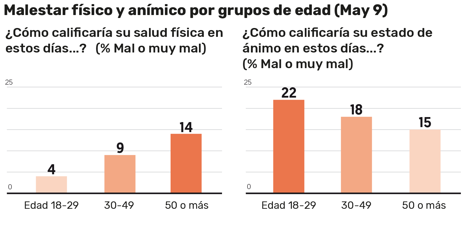 Esto quiere decir que el malestar anímico está un poco más extendido entre los jóvenes que entre los mayores, ya que el porcentaje de entrevistados que describen su estado de ánimo como malo o muy malo alcanza 22 por ciento entre los mexicanos de 18 a 29 años, baja a 18 por ciento entre los de 30 a 49 años y hasta 15 por ciento entre los de 50 años o más.