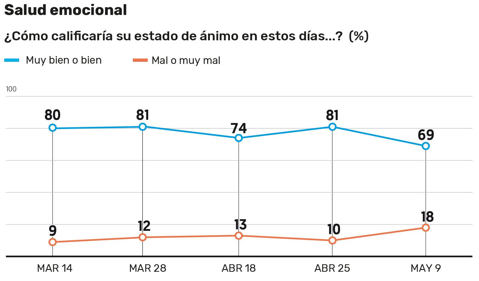 La encuesta arrojó que del 14 de marzo, al 9 de mayo, el estado de ánimo de gran parte de los mexicanos se duplicó de “malo” a “muy malo” en las últimas semanas, pasando de un 9% a 18%, según el estudio.
