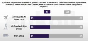 Este estudio reveló que la mayoría de los mexicanos prefería que López Obrador cancelará sus proyectos principales y se ocupará en brindar atención a rubros socio-económicos que en este momento requieren total cuidado.