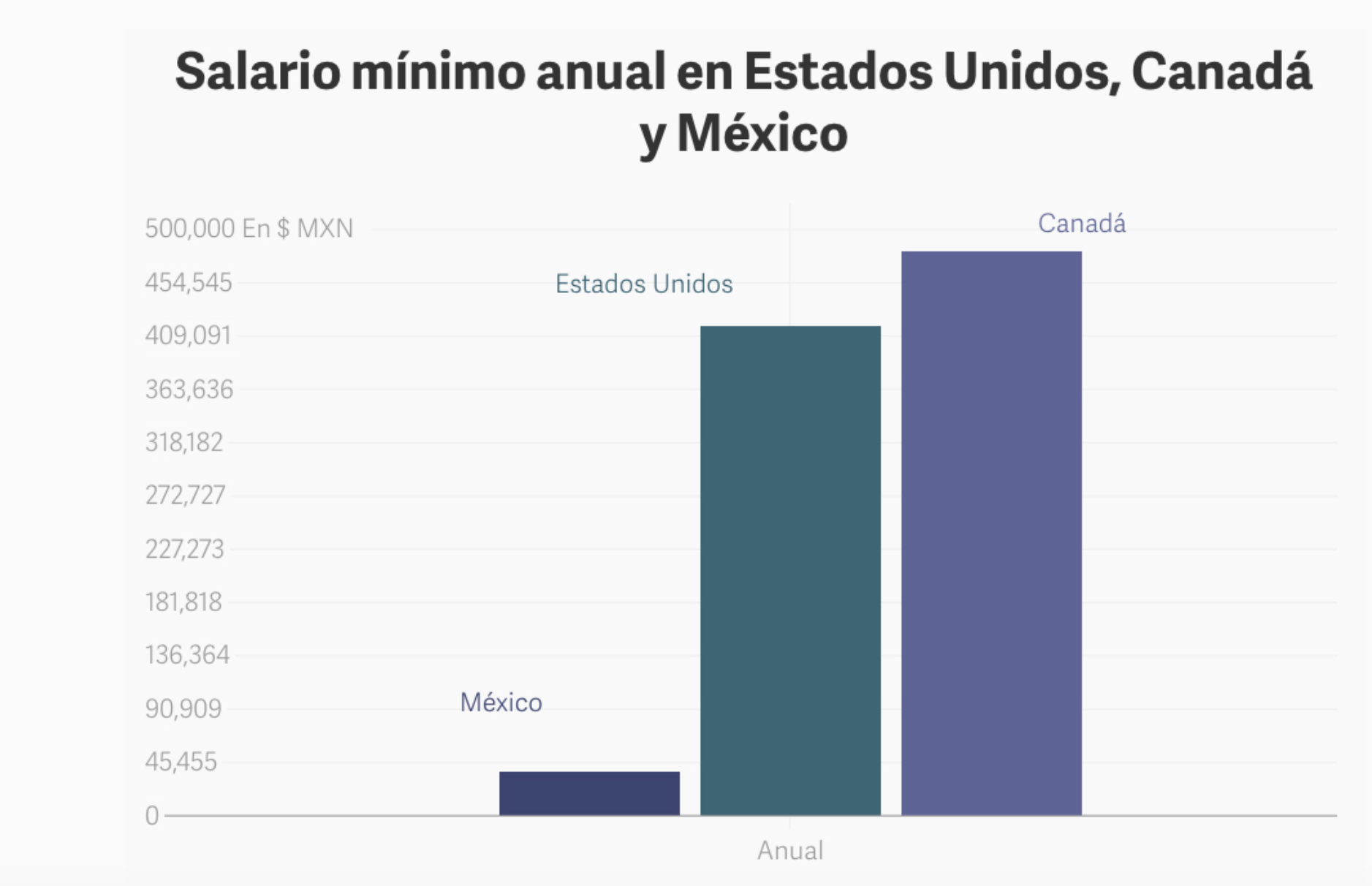 Por último, uno de los temas que más destaca es el salario mínimo, el cual México tiene el más bajo entre los tres socios del bloque comercial de América del Norte (antes TLCAN y, próximamente, USMCA o T-MEC), con un monto de 37,400 pesos anuales contra a los más de 400,000 pesos anuales que se pagan en Estados Unidos y los casi 500,000 pesos anuales que se pagan en Canadá.