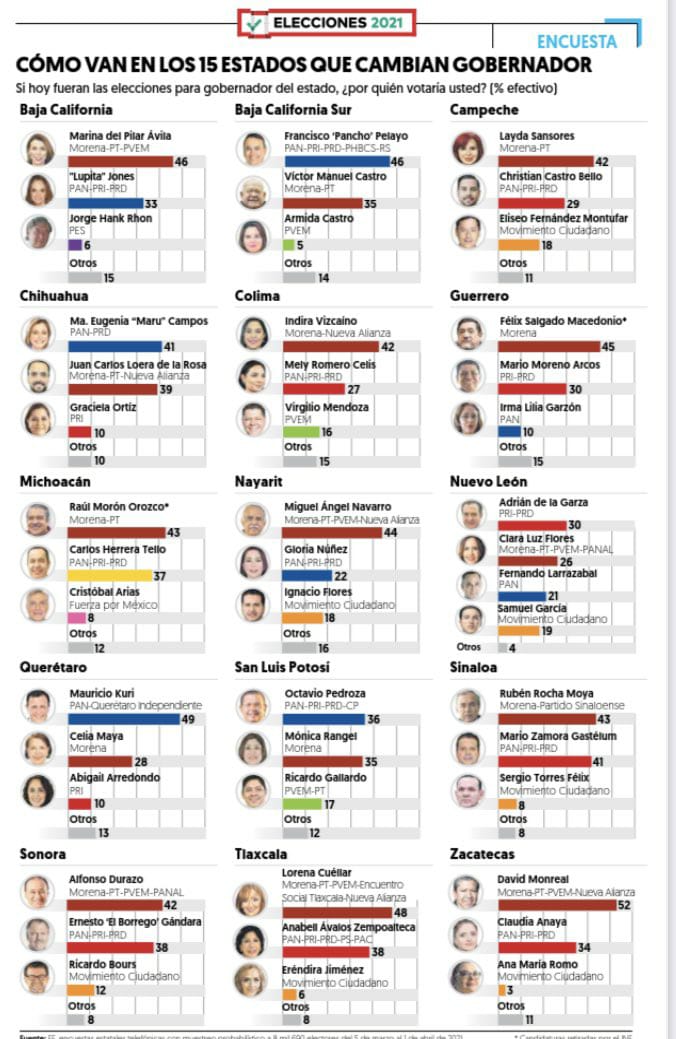 Algo similar ocurre en Campaeche, donde Layda Sansores de Morena mantiene el primer lugar con el 42 por ciento de la intención del voto. Mientras que en segundo lugar se encuentra Cristian Castro Bello de la alianza PAN-PRI-PRD con el 29 por ciento de los votantes. En este caso, Movimiento Ciudadano tiene el 18 por ciento que le falta a la oposición para vencer a Morena.