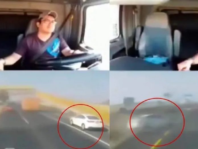 Una vez que pierde el control, termina chocando contra el muro divisor e impactando contra una pipa, misma que termina aplastando al vehículo.