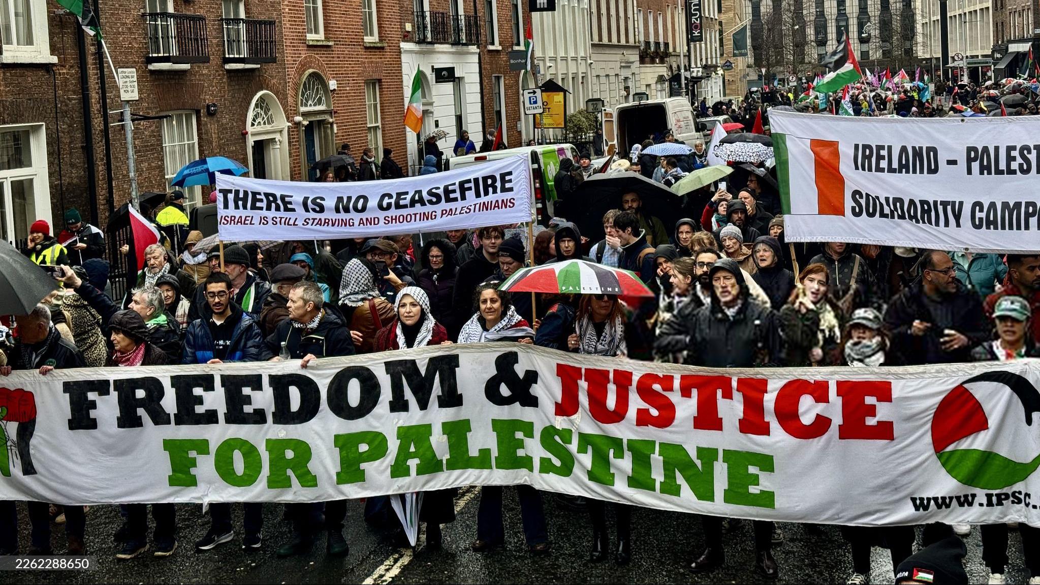 Los manifestantes portaron banderas palestinas y corearon consignas a favor de la justicia y en contra de la ofensiva militar israelí. Durante el acto, varios oradores denunciaron la situación humanitaria en Gaza e instaron al Gobierno de Irlanda a impulsar medidas más firmes dentro de la Unión Europea.